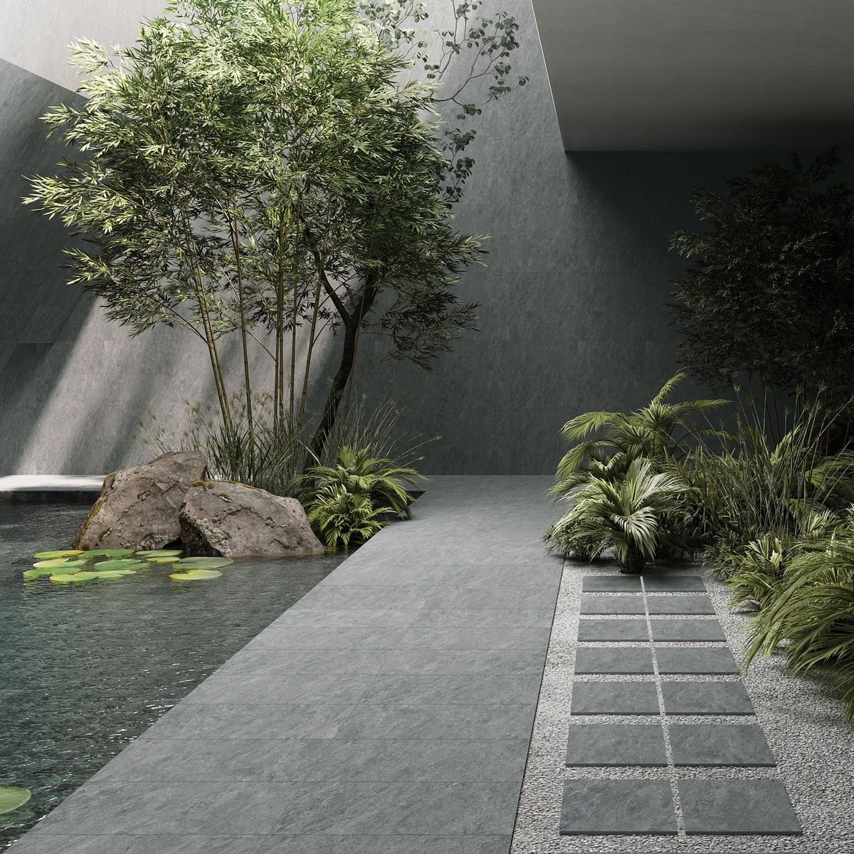 Коллекция Quarstone от Vitra представляет керамогранит в сером цвете. Формат плитки — 60x60 см.