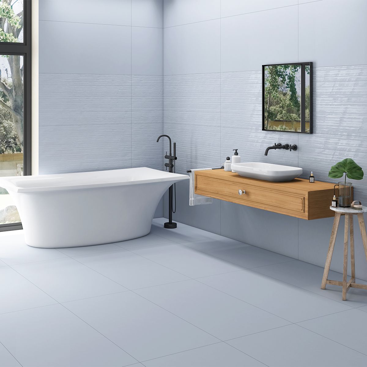 Керамогранит имеет размер 60x120 см и матовую поверхность, которая придаёт ему элегантный и современный вид. Голубой оттенок керамогранита прекрасно сочетается с различными стилями оформления и может использоваться для создания как спокойных, так и ярких дизайнерских решений.